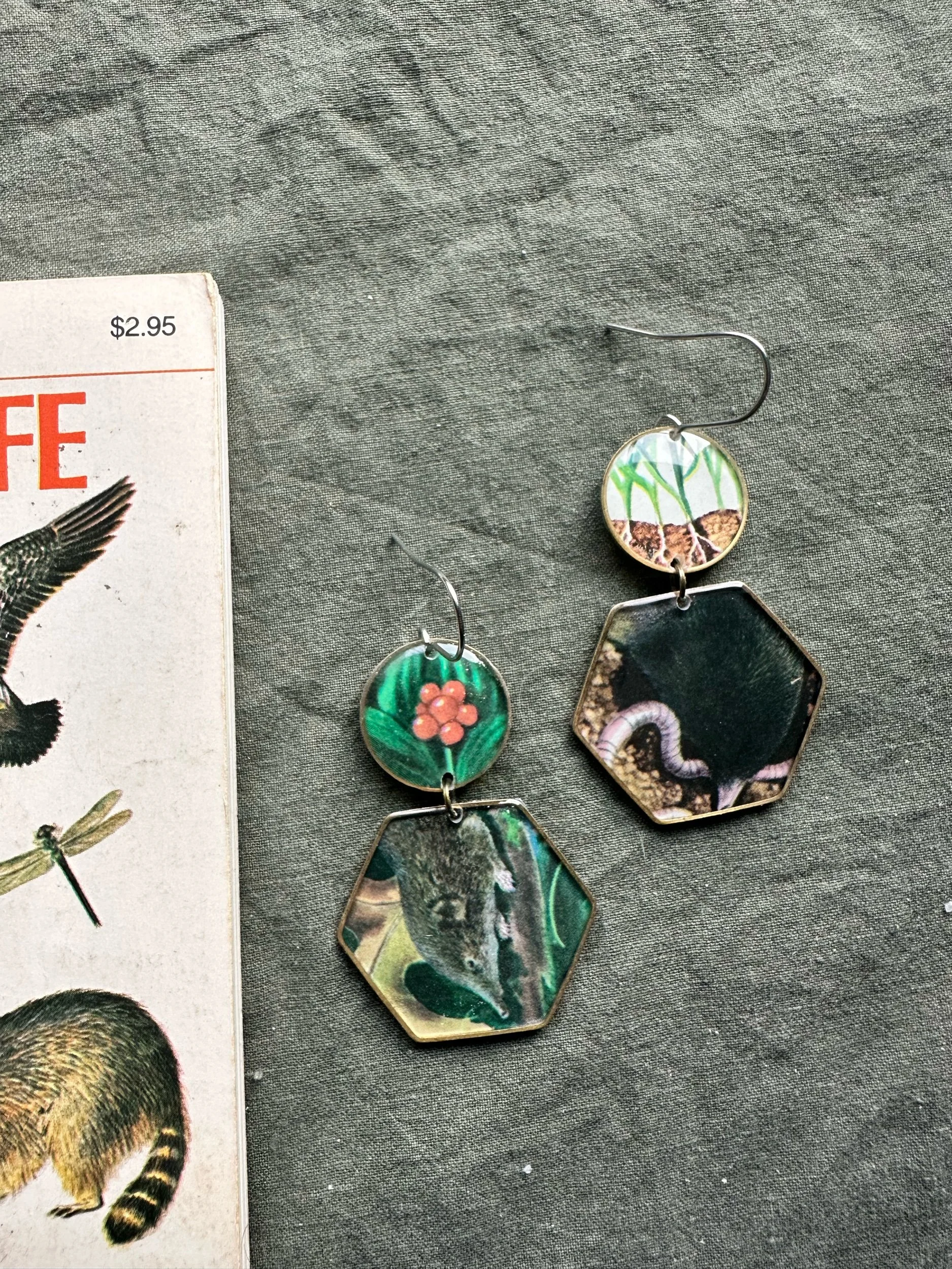 Made from retired field guides from these are perfect for a nature lover like me who loves jewelry :) these are light and on surgical stainless steel hooks. Hooks can be replaced with clip ons, just send me a message.